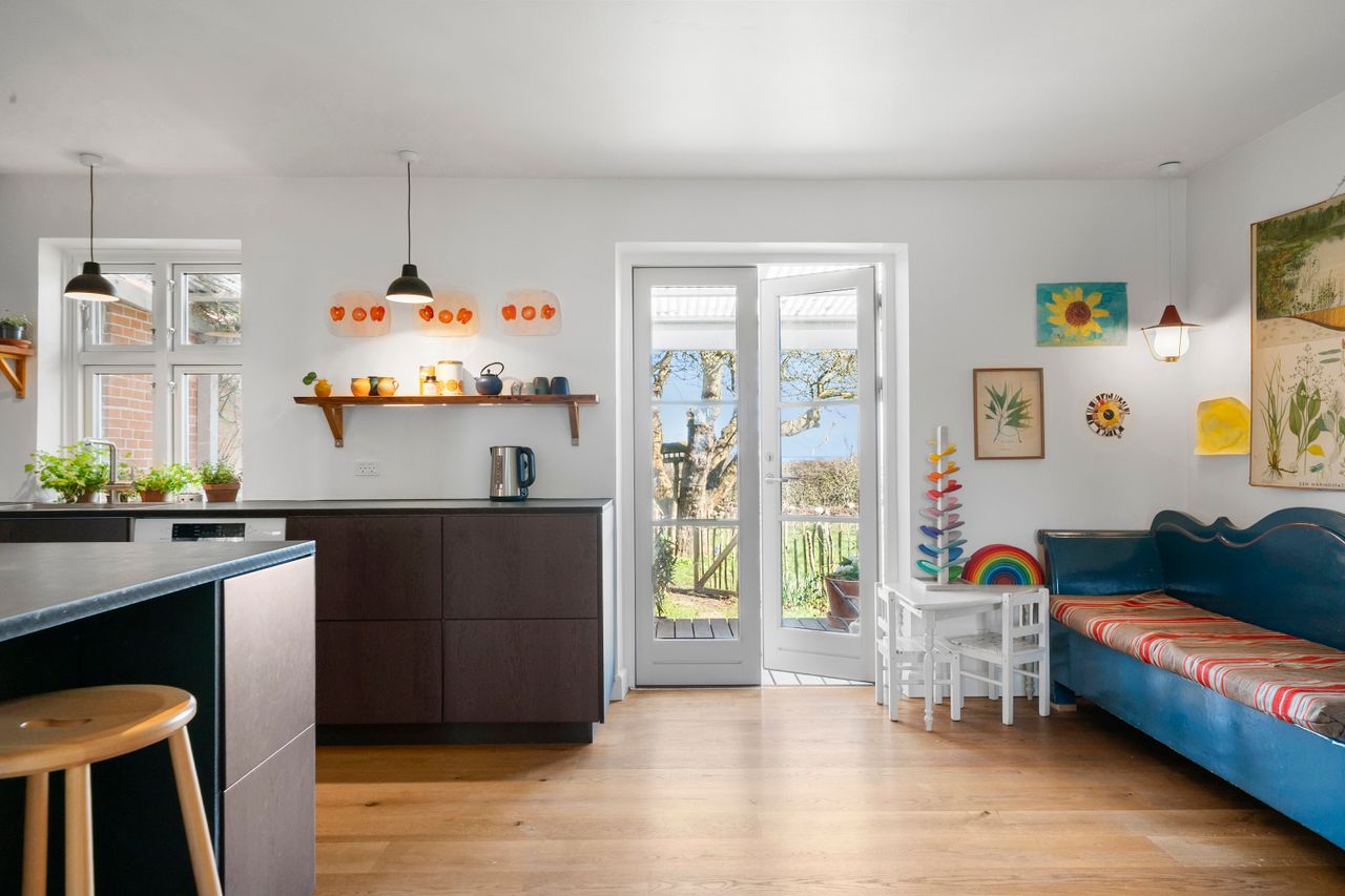 Stueplan har ligeledes fået en gennemgribende modernisering, hvor et nyt, lækkert køkken blev installeret. Herfra er der direkte udgang til en dejlig terrasse med en skøn udsigt over de åbne marker og helt ned til vandet ved Bøgebjerg Strand. Selvom havet per definition er blåt, vil du bliver overrasket over, hvor mange nuancer af blå der findes. Den udsigt skal opleves.