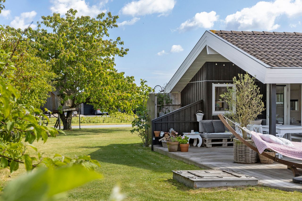 Udenfor venter en fredelig, grøn oase med masser af plads til leg, grillhygge og afslapning. Grunden ligger godt og privat og tæt ved er der større grønne fællesarealer, som giver ekstra albuerum - og en tryg legeplads for børnene. Via små stier er der blot ca. 300 meter til den skønne badestrand, så det er nemt at få en dukkert. Når du kommer tilbage til huset, kan du skylle dig af under udendørsbruseren.