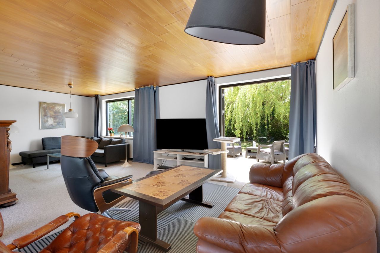Den rummelige vinkelstue har udgang til den sydvestvendte terrasse gennem dobbeltdør.