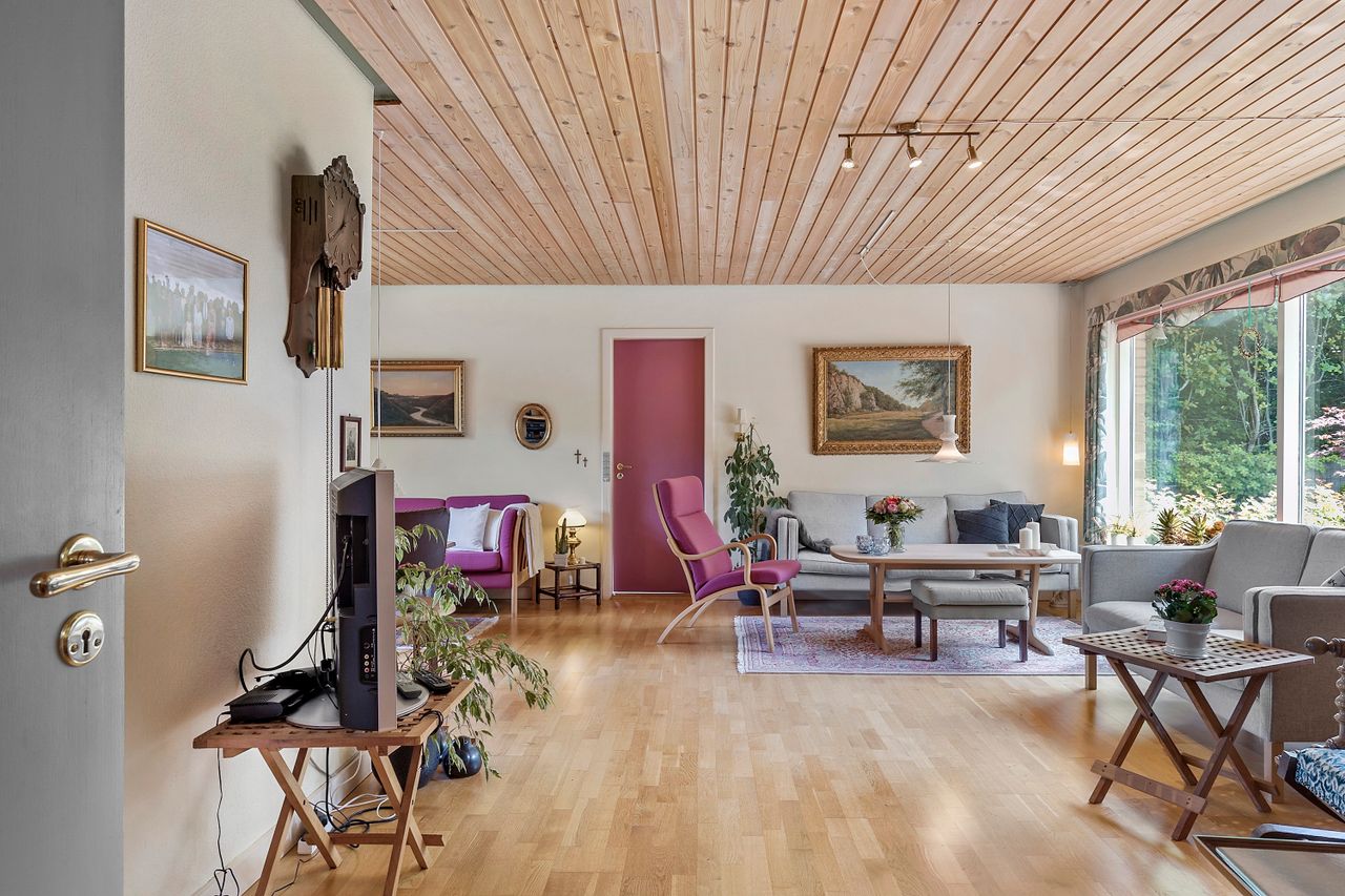 Fra den store stue er der adgang til en tilstødende opholdsstue, som åbner ud mod en dejlig, aflukket sydvestvendt have – perfekt til både afslapning og udeliv.