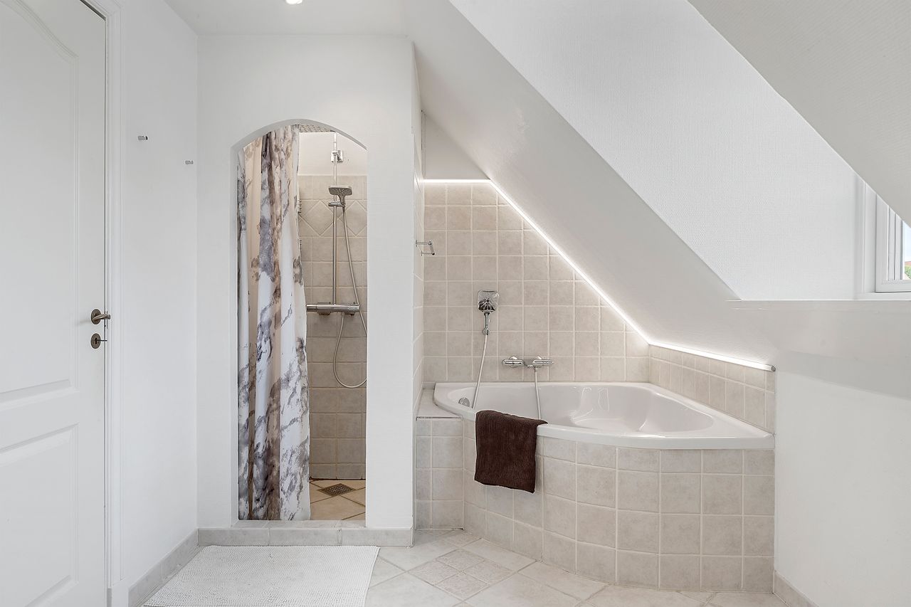 Indretningen på 1. salen er gennemtænkt med flere gode værelser. Lige nu er det indrettet med 4 værelser + et walk-in, men oprindeligt har det ene værelse været ét stort, som nemt kan etableres igen, hvis man sætter pris på et større forældresoveværelse. Badeværelset på 1. salen er moderne og lyst med dobbelt håndvask og god skabsplads.