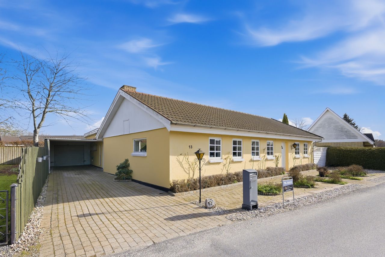 Grunden giver god plads til leg, trampolin og sommerhygge. Derudover får I både garage og carport, så både bil og opbevaring er tænkt ind.