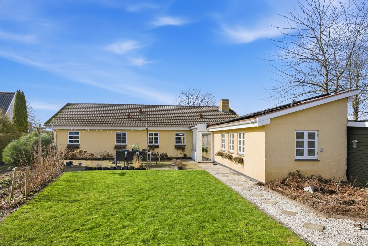 Huset indeholder flere værelser, som kan indrettes som børneværelser, soveværelse eller hjemmekontor, samt badeværelse og bryggers med egen indgang, praktisk i en travl hverdag. Den indbyggede udestue giver ekstra plads og kan fungere som legerum, opholdsrum eller et fristed med udsigt til haven.
