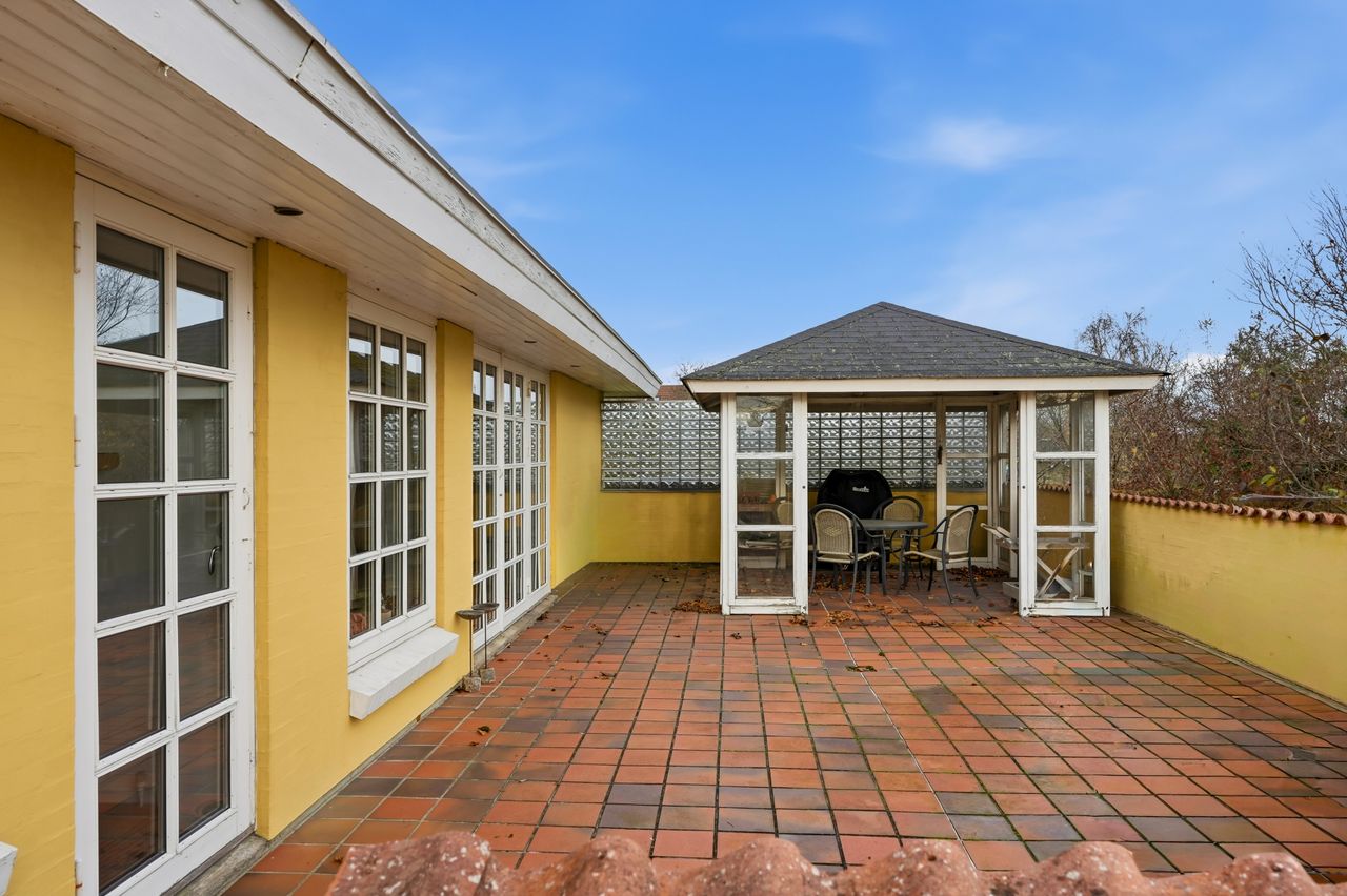 Husets naturlige samlingspunkt er det store og lyse opholdsrum med stue og køkken i forlængelse af hinanden. Herfra er der en enestående udsigt til fjorden, som også kan nydes fra forældresoveværelset. Der er direkte udgang til en stor, flisebelagt terrasse, som strækker sig i hele husets bredde – perfekt til sommerens grillaftener og afslapning med udsigt og ro.