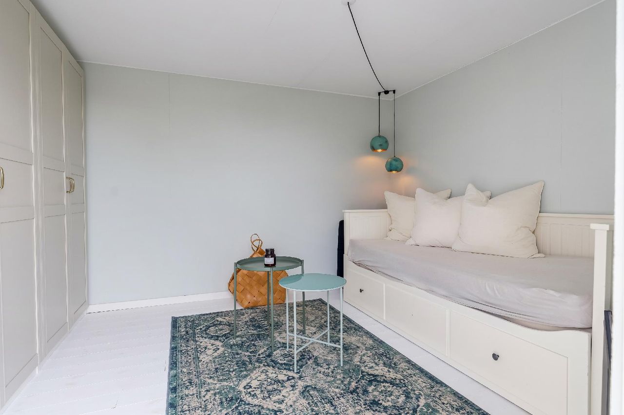 Huset er indrettet med fire værelser og endnu flere sovepladser, så der er rig mulighed for at samle hele familien eller vennerne til hyggelige stunder. Selvom sommerhuset officielt er 35 m², får du hele 57 m² at boltre dig på, da en tidligere garage er omdannet til ekstra opholdsrum. De to bygninger er forbundet af en overdækket terrasse – det perfekte sted at nyde de lune sommeraftener med et glas vin, drinks eller en god bog.