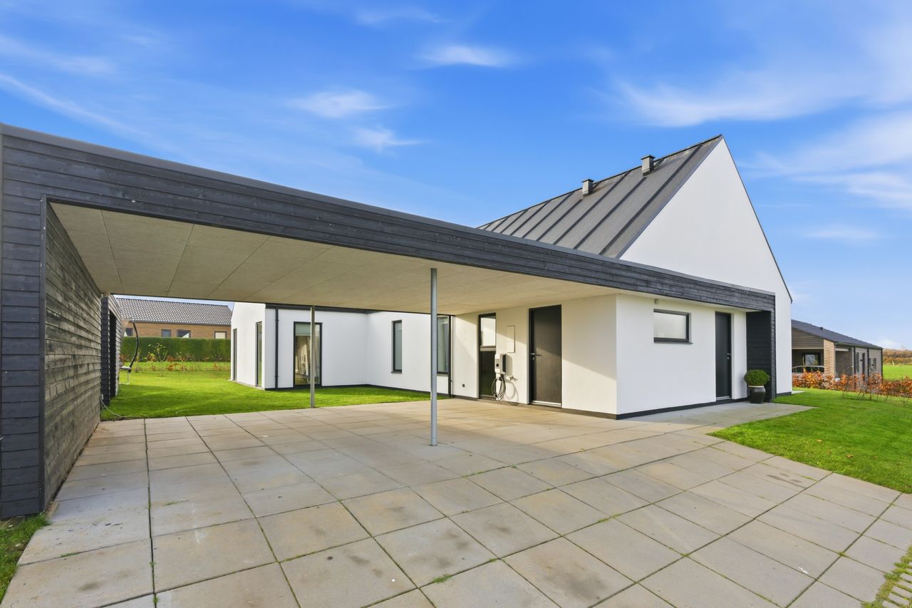 Foran huset finder du en rummelig dobbeltcarport med tør adgang til hoveddøren – en praktisk løsning i hverdagen.